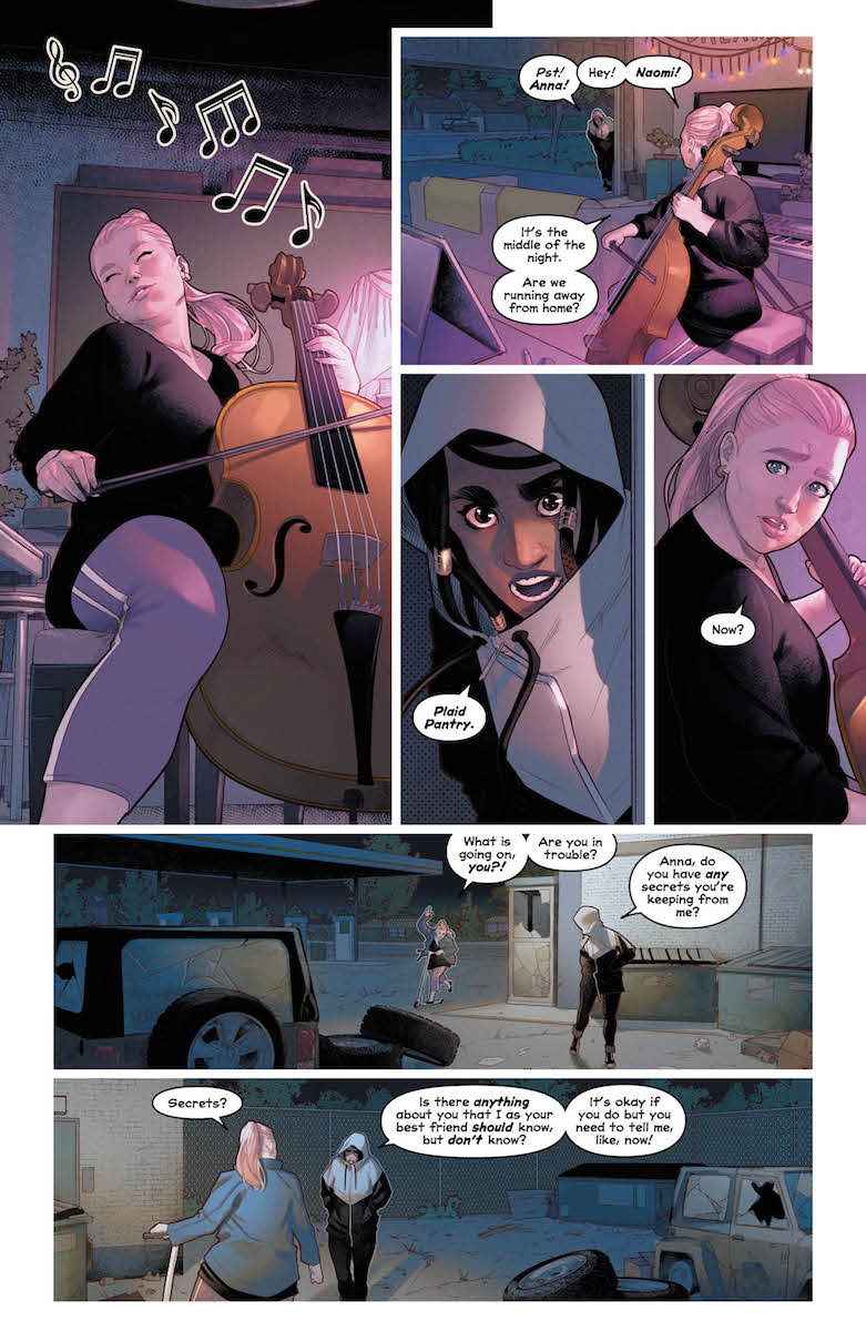 Corrina: This is the problem with decompression: because it’s been a few months, I barely remember who Naomi’s friend Anna is, nevermind the relationship between Naomi and Anna, and that means Naomi’s big reveal to her friend falls completely flat.