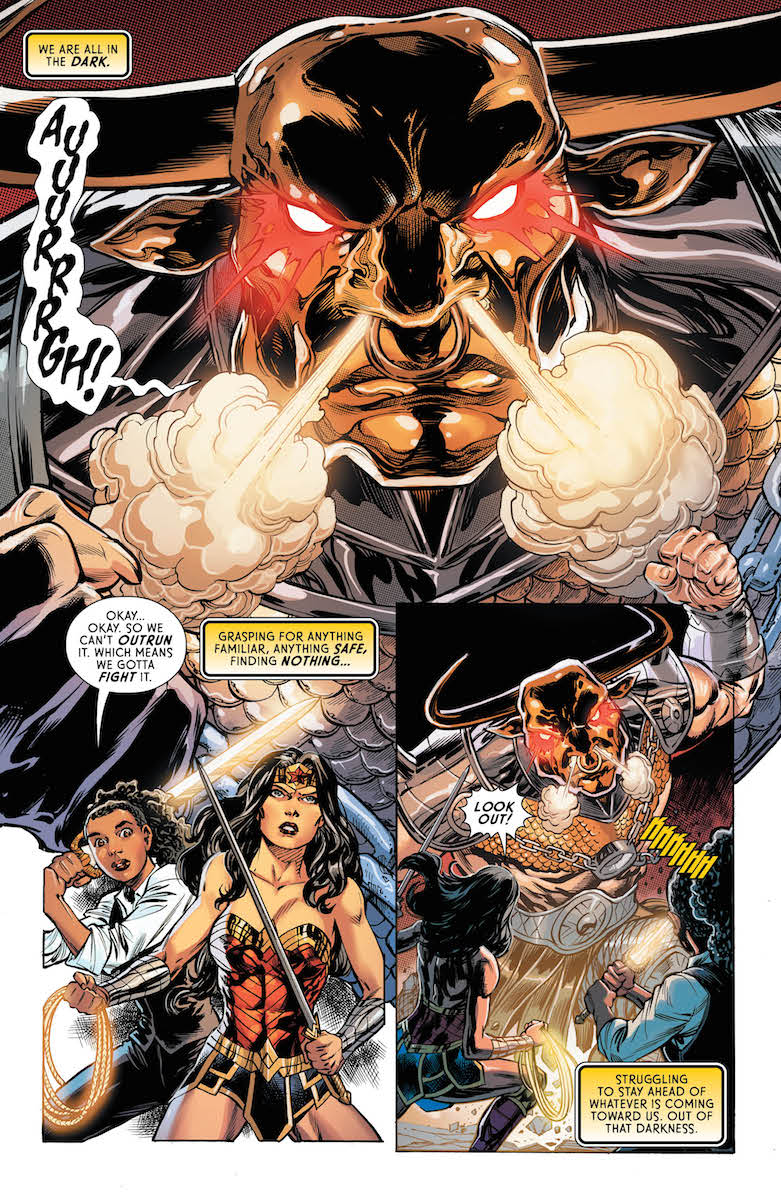 Ray: G. Willow Wilson’s fantasy-based run on Diana’s flagship title continues to be a compelling adventure that upends its concept every few issues. The last issue wrapped up the plotline involving the small town that Atlantiades had enthralled but wasted no time pulling Diana’s new ally Maggie into a new adventure. As she entered the shrine that led to the underworld, she encountered a massive minotaur, and soon enough she and Diana were locked in battle. Wonder Woman #72 is an action-heavy issue, much of it taking place in the dark, so I don’t know if it’s quite as compelling as the last few. The art by Jesus Merino and Tom Derenikc is excellent, especially when depicting the monster (who is definitely not as friendly as Ferdinand). The massive titan is strong enough to fend off Wonder Woman, but Maggie’s sword is something else entirely and the characters are only beginning to reveal its power levels. What’s more, it seems to be a beacon pointing to its original owner.