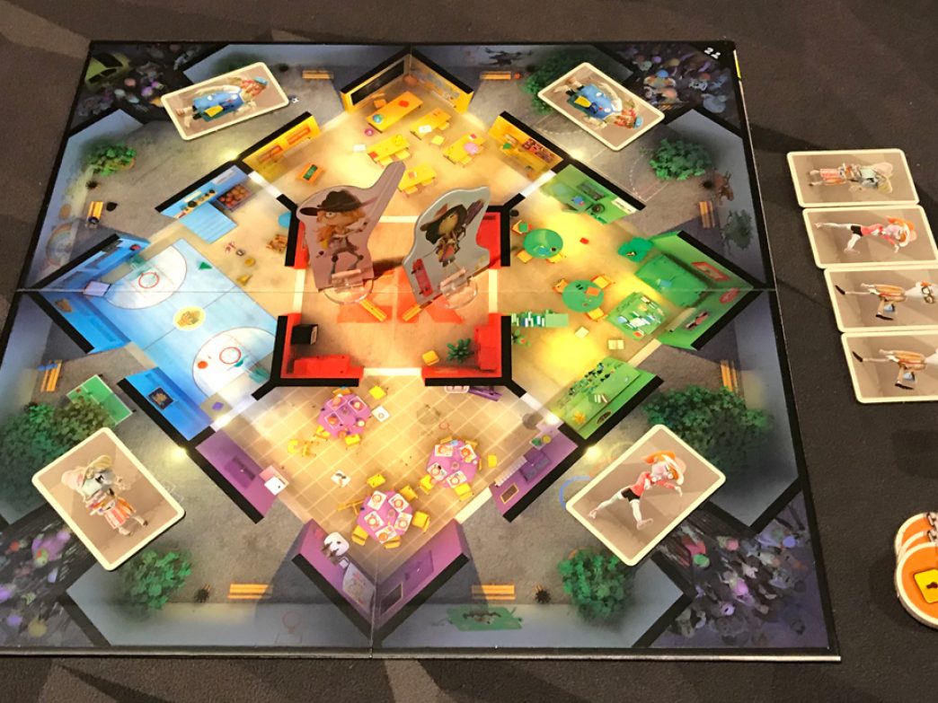 The board shows a bird’s-eye view of a school, with various interconnected classrooms and four exterior yards with gates. There’s a daytime side and a night-time side: the night-time side is used for 2 players, and includes extra doorways between the outer ring of rooms. The board has a lot of fun details that make the rooms distinct—there’s a gym, a library, a classroom, a lunchroom, and a central area with lockers.