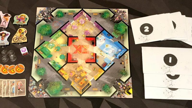 Zombie Kidz Evolution is a legacy-style cooperative game for 2 to 4 players, ages 7 and up, and takes about 15 minutes to play… if you can limit yourself to one session, that is. It retails for $22.99 and is available in stores now or online. Although the game does feature zombies, they’re fairly cartoonish and the game isn’t scary—even my own kids, who normally refuse to play anything with zombies, didn’t mind fighting zombies in this one. Zombie Kidz Evolution was published by Scorpion Masque, and is distributed in the USA by Iello.