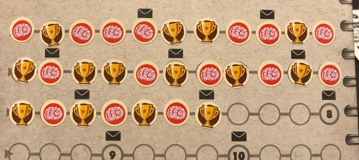 The rulebook isn’t pictured in my components photo, though it’s also an important piece of the game. The outside is made to look like a spiral-bound notebook with lots of stickers on the cover, so it’s only appropriate that you’ll be putting stickers on the back cover, too. There’s a progress chart on the back that you’ll soon be filling up with brain and (you hope) trophy stickers. Inside the rulebook, you’ll also notice a few sections that have large blank areas: some in “Advanced Rules” and some in “Missions.” More about those later.