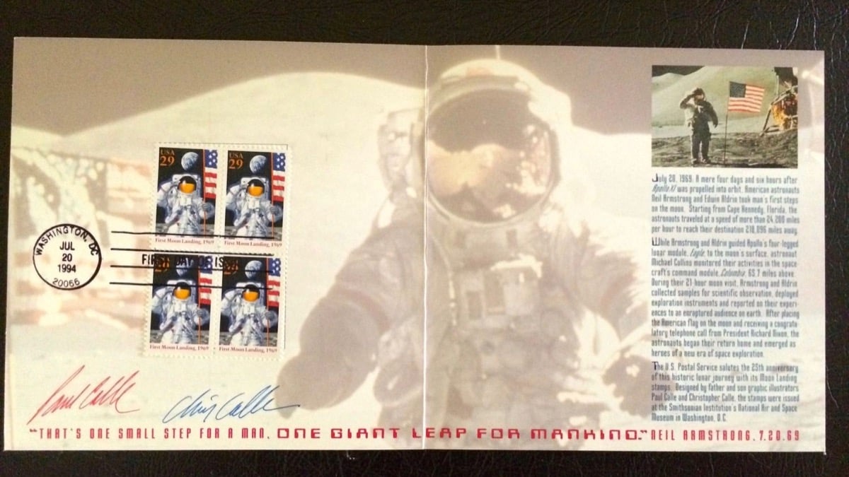 25 years ago I was at the Smithsonian Air and Space Museum for the 25th anniversary of Apollo 11. To commemorate the event, the Air and Space Museum held a 1st day of issue ceremony for the new US Postal Service stamps (a 29 cent stamp and a $9.95 express mail stamp). After the ceremony the artists behind the design of the stamps were available to sign the the stamps (which were available for sale and stamped as “1st day of issue cancellation” by the Post Office). So I bought the poster of the iconic picture of Buzz Aldrin standing on the surface of the Moon, attached several stamps to the poster, had them 1st Day of Issue stamped right there on the poster, and had the stamp designers sign the poster right under the stamps. I have this poster proudly displayed in my home. For me, this is a personal link to one of the most important events in human history, and I wouldn’t trade it for anything.