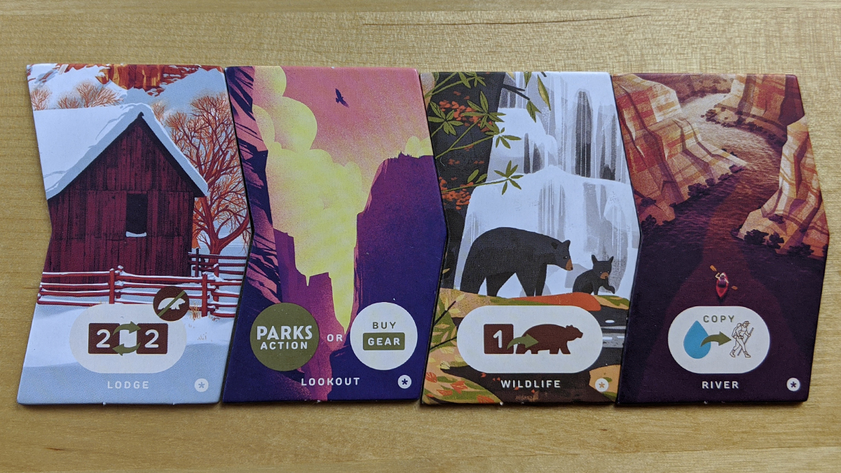 Most of the canteens give players bonus resources. For instance, there is a canteen card that gives you two sunshines, so you basically use it to trade a single water for two suns. There are canteens in the deck that allow you to perform a two-for-two swap, so in essence, you can perform the lodge action whenever you want. But best of all—and it’s worth doing what you can to dig through the deck to find these—are the three canteen cards that allow you to either exchange a resource for a wild or (even more useful) reserve a park. Because reserving parks not only allow you to pay for them later when you can, but also removes the ability for other players to claim them, this can be a game-altering move, and having the canteens and being able to do this essentially any time you get water is very powerful.