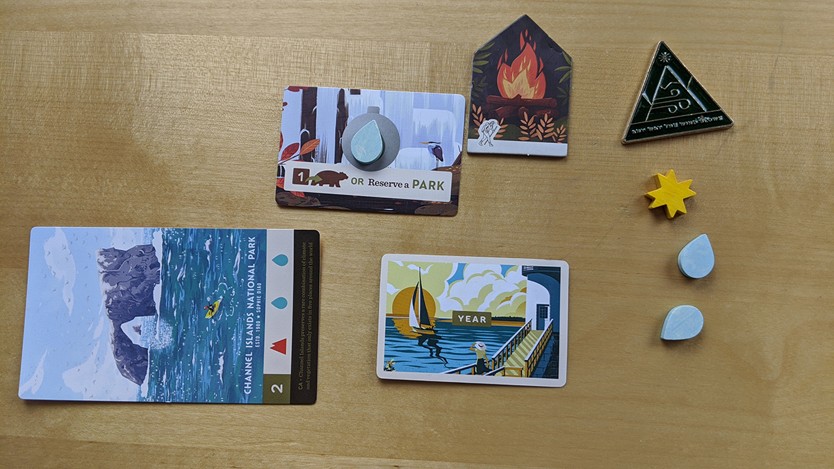 A second way to mess with your opponents is through the reserve parks action. If you saw that someone was collecting resources and it was obvious that they were hoping to visit a high-point park that was faceup on the board, you could use your canteen to play the reserve a park action when your opponent wasn’t ready for it and grab the park they were trying to buy. Parks you have reserved don’t give you points—you only get points for visiting parks—but there’s also no penalty for having them, so other than losing the water token for activating your canteen, there’s not a lot of downside to offensively reserving a park over reserving one you actually wanted.