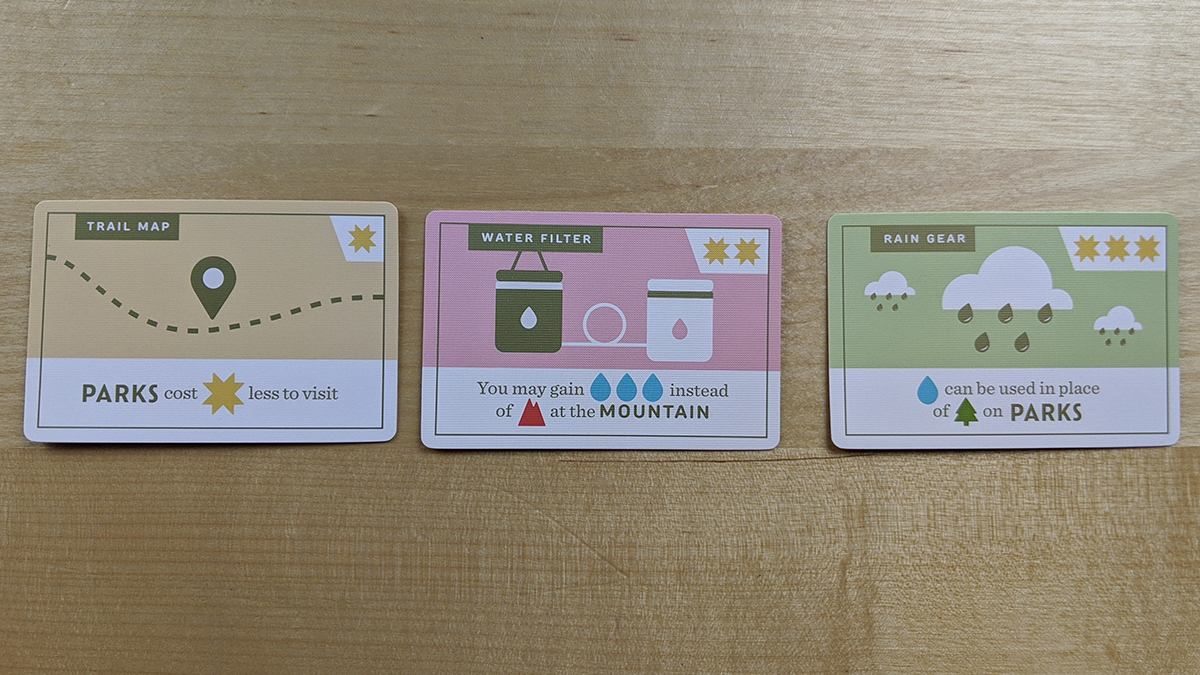 The second option is to buy gear. Gear costs either one, two, or three sunshine tokens to buy, although the first (and in a four and five-player game, first two) player to choose to buy gear each season gets a one-sun discount (which, yes, does make gear that costs a single sun free). Gear cards provide additional bonuses that, unlike canteens, are always available. There are gear cards that make parks cheaper, give ways to fill canteens for free, or even to make future gear purchases cheaper. Gear, like canteens, is an element of the game that’s easy to dismiss, but we found in playing the game and judicious use of gear can make a huge difference.