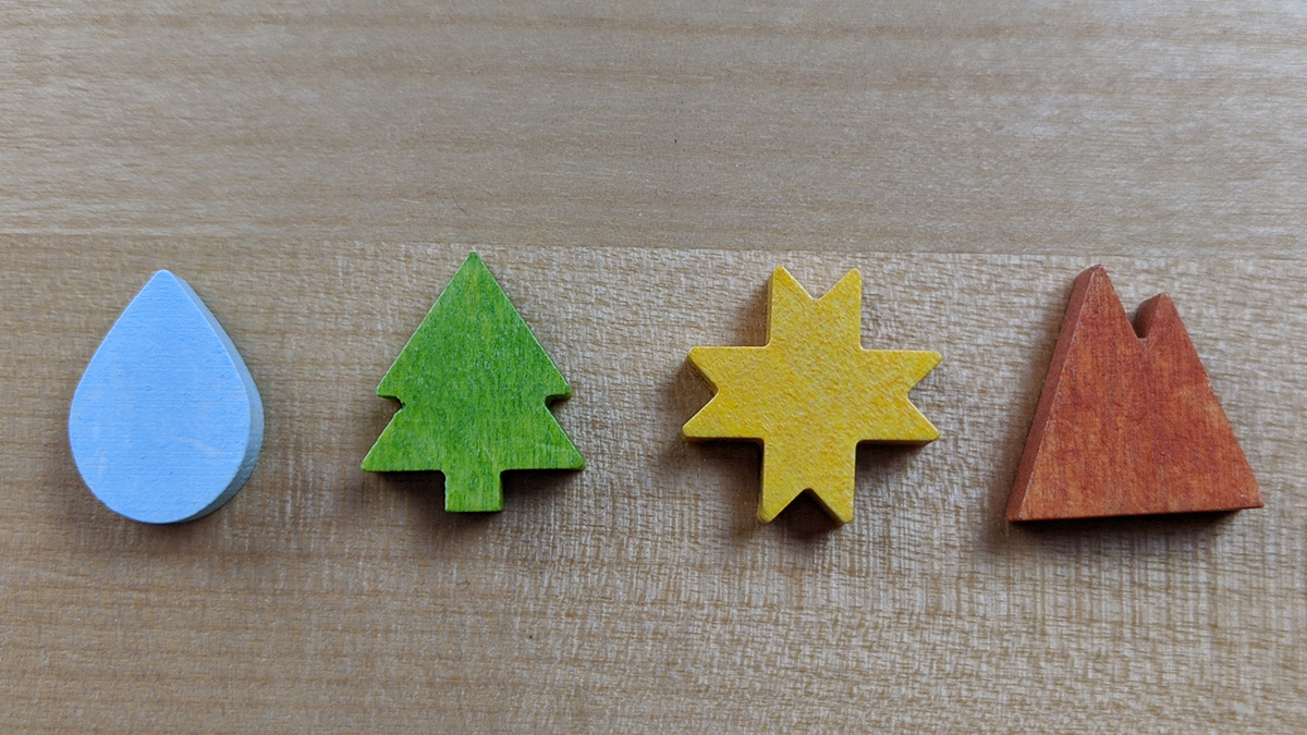 The main wood components, though, are the resources. These are all custom shaped to match the type of resource and are a bit thinner than normal wooden tokens you see in most games, which I’m guessing was done to allow them to fit in smaller trays and thus allow the game to be in a smaller box. The forest, mountain, sunshine, and water tokens are all nice in that they express, through both shape and color, what they are.