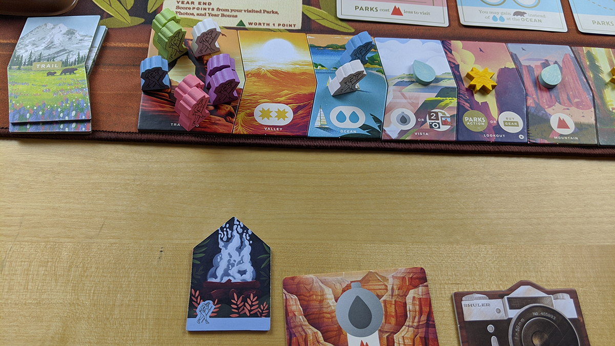 Like other resource-driven games, PARKS forces you to balance collecting resources and spending them, but it adds in the ability to do other things as well, such as taking photos, that don’t require you to spend tokens but do use up the very limited supply of actions you get each turn.
