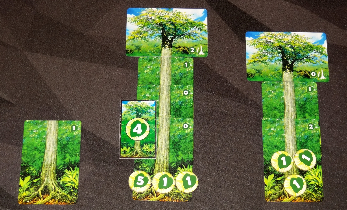 Trees: Score your completed trees that have not been scored already in previous seasons. Each trunk card is worth its printed value; the canopy card is worth a certain number of points per trunk card in that tree. Also, the player with the tallest tree completed this season earns a bonus award: 3 points in the first season, 4 points in the second season, and 5 points in the third season. (If there’s a tie for tallest tree, both players earn the points for that award.)