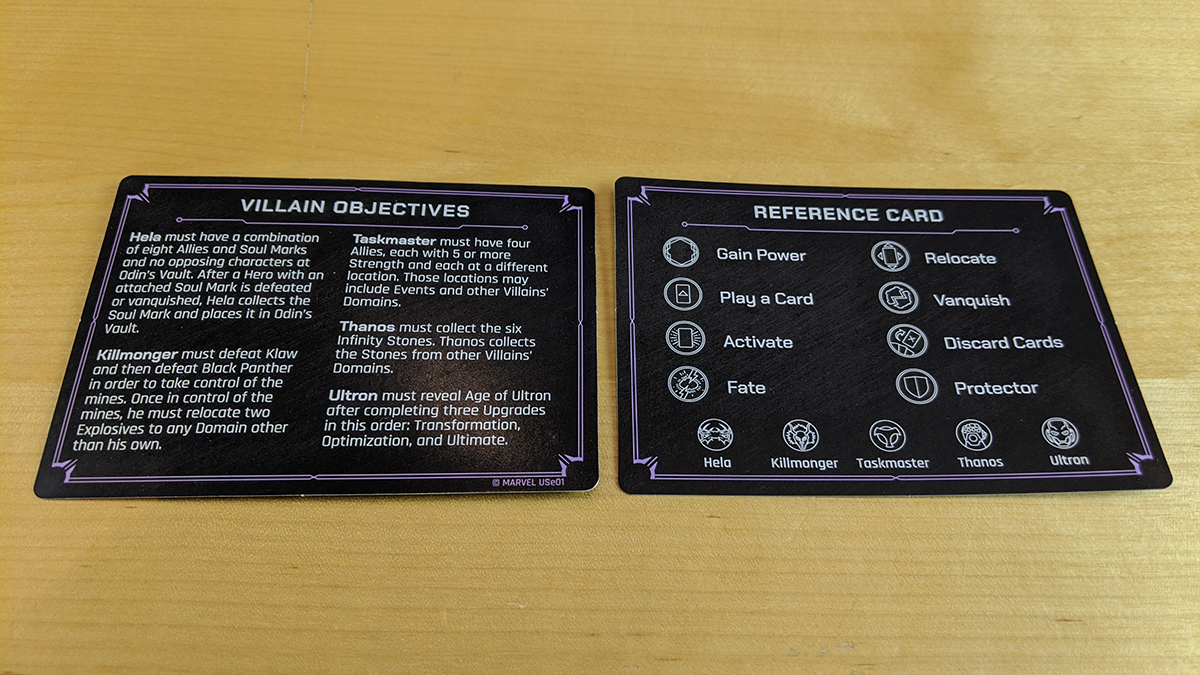 Ultron starts the game with four upgrades in his specialty area. Each has a set of requirements in order to become active; for example, the first upgrade, Transformation, requires that Ultron play two sentries (a type of ally in his deck) to his domain. Once that is completed, the upgrade is flipped over and becomes a specialty, so when the Transformation is complete, Ultron can add a card to his hand anytime he plays another sentry. The upgrades must be worked through in order, and when the final one, Age of Ultron, is played, Ultron wins.