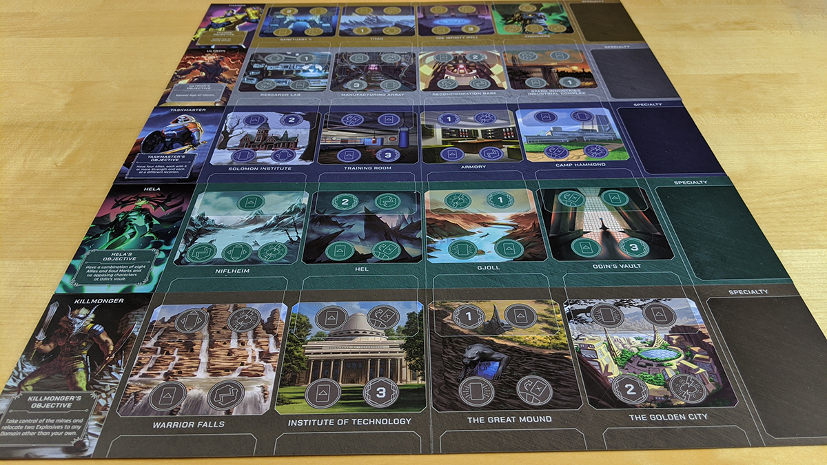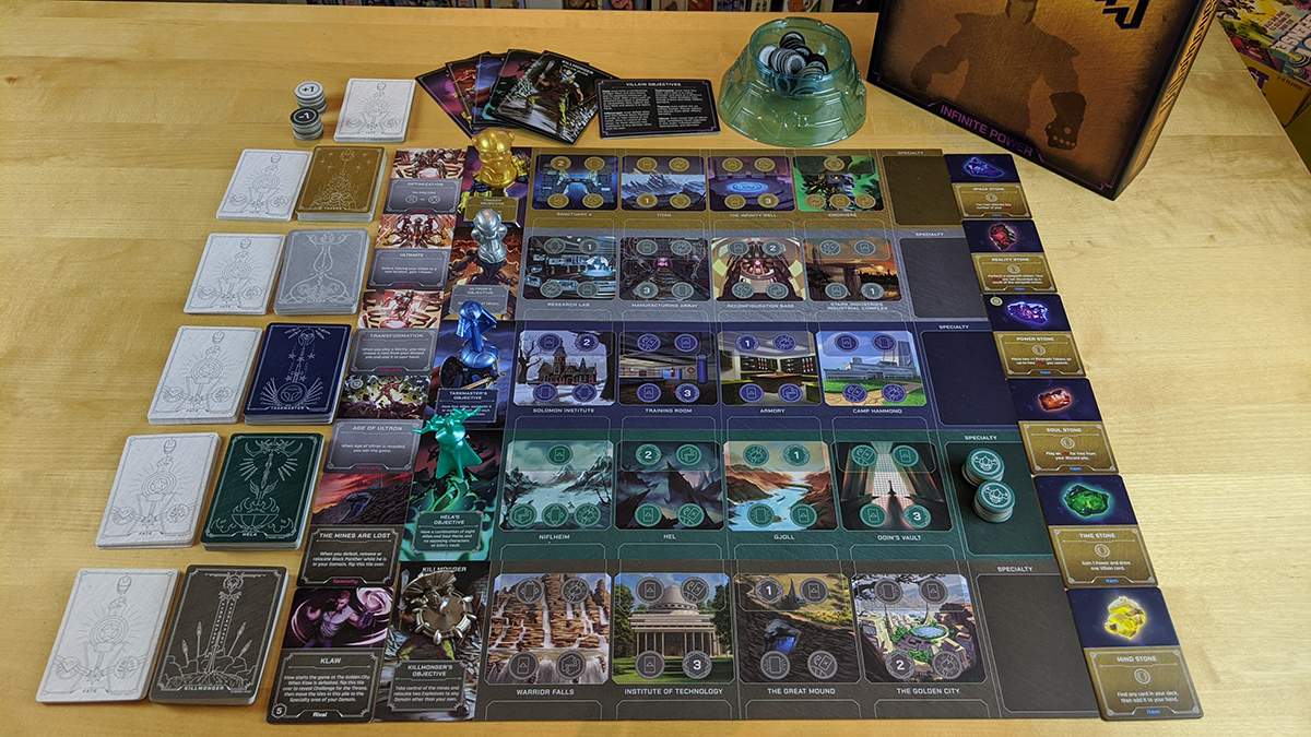 A few of the later Disney titles have tiles (i.e., cardboard pieces), such as the Repunzel hero and Pete objectives from Perfectly Wretched. Here, these tiles are combined with the new speciality category. Thanos, of course, needs to collect the Infinity Stones, each of which is a tile. Ultron needs to upgrade himself, and as such has four speciality tiles he needs to work through. Killmonger’s quest to take over Wakanda is likewise represented through tiles.