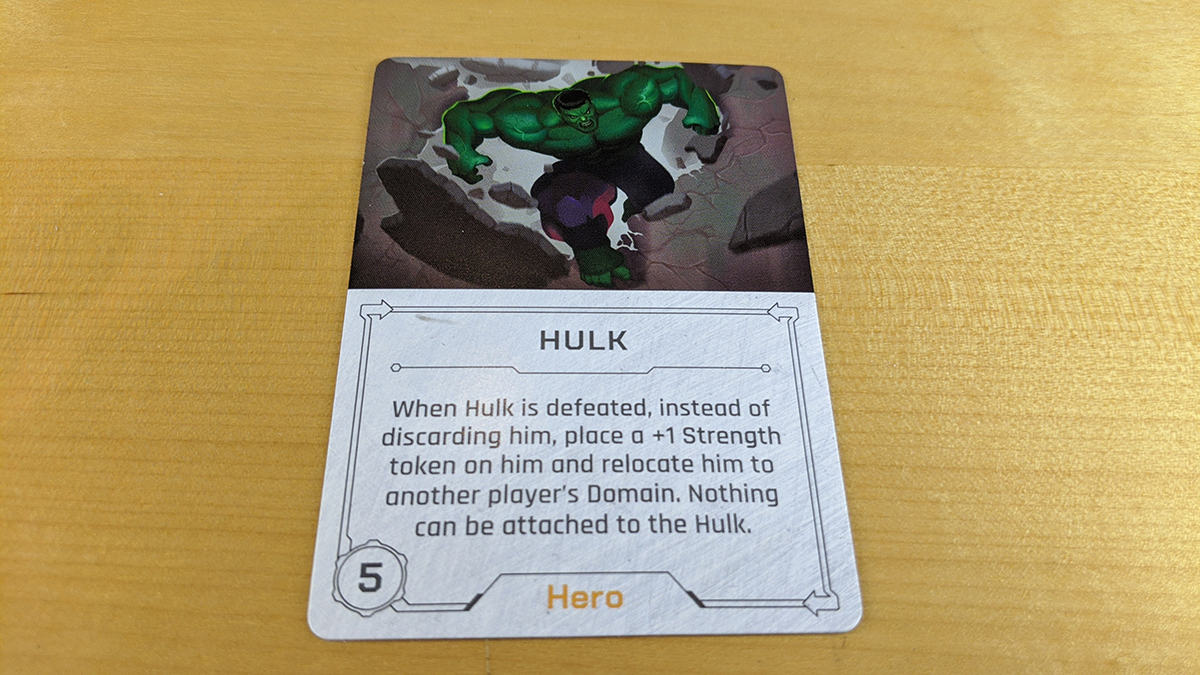 But by far my favorite hero–easily the best hero in all of Villainous–is The Hulk. He enters the game at strength 5, which is high for heroes but not rediculously so (Captain Marvel starts at 6). But, when the Hulk is defeated, unlike every other hero in the franchise, he isn’t discarded. Instead, the player who defeated him puts a +1 strength marker on him and moves him to another player’s domain. In other words, he can’t be beaten. He can only be pushed off to be someone else’s problem, but he gets angrier each time that happens, and as he gets angier, he gets stronger. That’s just awesome.