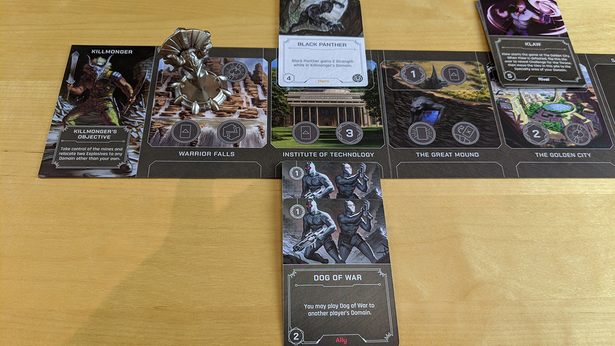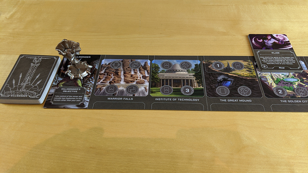 Killmonger is the other villain with the ability to play to other player’s domains. In order to win, Killmonger needs to take control of the mines (one of his objective tiles) and then relocate two explosives (a type of card in his deck) to other domains. During setup, the Killmonger player places the two objective tiles, with Klaw on top, on the Golden City location. Klaw (technically a rival, but he plays basically like a hero) must first be vanquished. That causes the player to flip the tile to reveal Challenge for the Throne–a specialty–where the player has to find Black Panther in the fate deck (assuming he isn’t already out) and place (or relocate) him at the Warrior Falls location. Once Killmonger defeats Black Panther, he gets the Control the Mines specialty, which lets him move the explosives. However, there’s a catch: should something else get played that puts Black Panther back into Killmonger’s domain, he must re-defeat him before he can move more explosives.