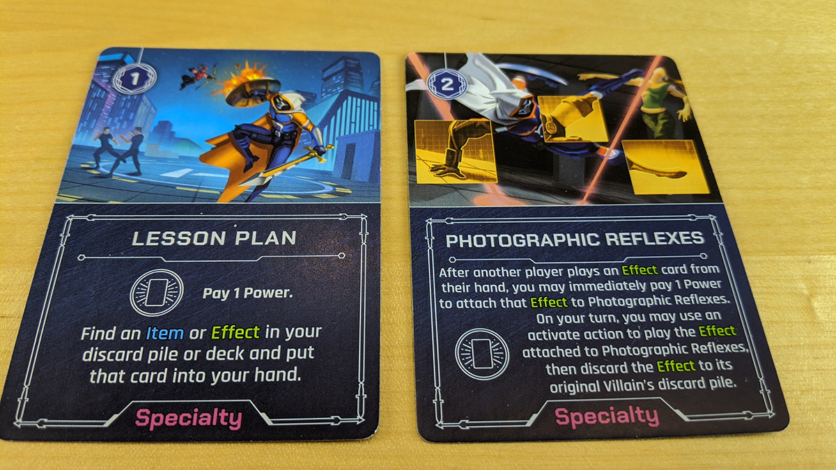 New in this version are “speciality” cards. These are ongoing effects: once a villain plays them, they remain in play until something else causes them to be discarded. But unlike allies or items, specialities aren’t tied to a specific place in the villain’s domain. They are more like player upgrades than anything else.