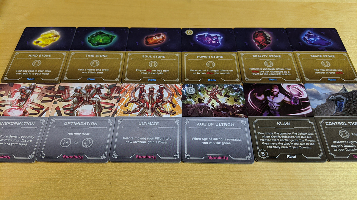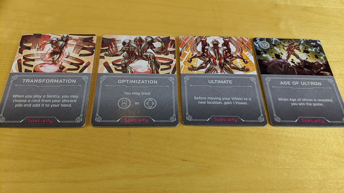 Ultron starts the game with four upgrades in his specialty area. Each has a set of requirements in order to become active; for example, the first upgrade, Transformation, requires that Ultron play two sentries (a type of ally in his deck) to his domain. Once that is completed, the upgrade is flipped over and becomes a specialty, so when the Transformation is complete, Ultron can add a card to his hand anytime he plays another sentry. The upgrades must be worked through in order, and when the final one, Age of Ultron, is played, Ultron wins.