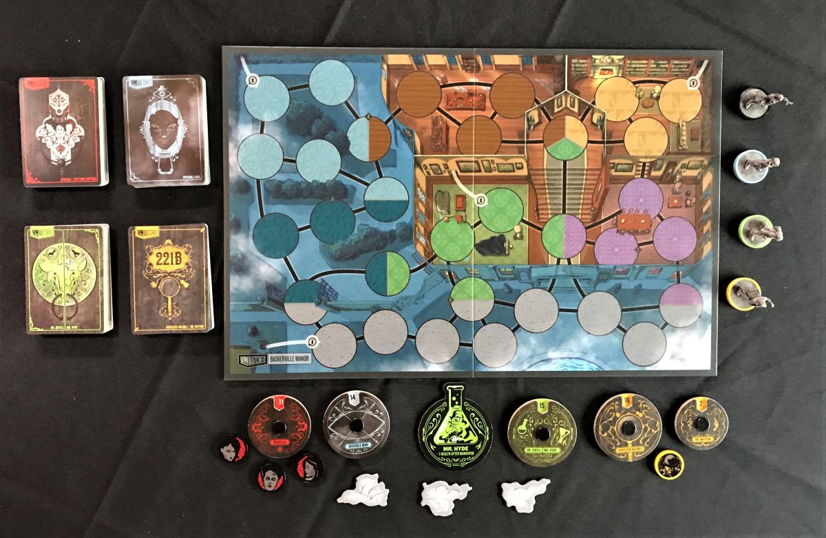 Battlefields can also affect gameplay. With the Jurassic Park battlefield, some pathways are one-way. And with the “Baskerville Manor” side of the Cobble & Fog 2-sided battlefield, you get secret passages that allow you to enter one of the four passages and pop out at any of the other three.
