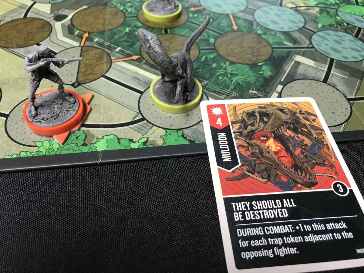 In Jurassic Park- InGen vs Raptors, the three raptors work together, with many of their cards emphasizing the pack hunting nature of the dinosaurs that we’re familiar with from the film. Muldoon is no slouch himself however; not only does he have three InGen sacrificial lambs, er, sidekicks to help fight the raptors, but he has a special ability to lay traps. These traps by themselves only do a single point of damage, but they also work in concert with other cards for various effects.