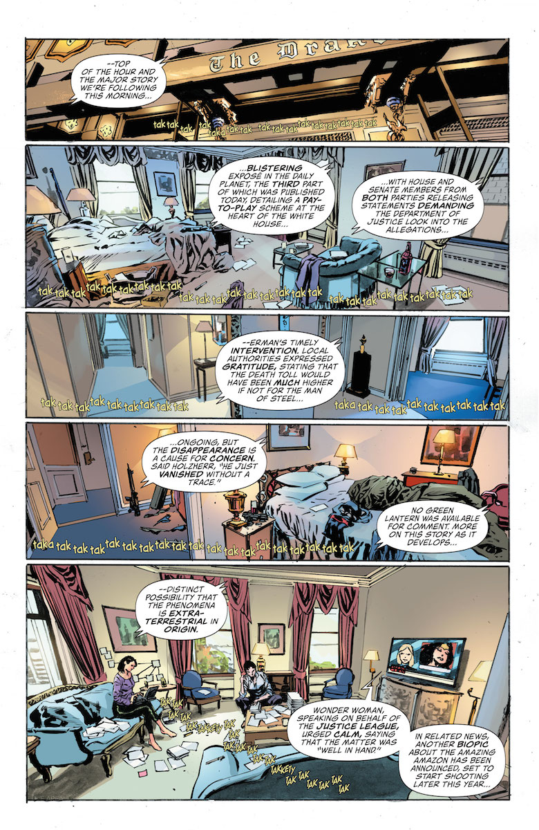 Much like the first issue, there are a lot of overarching social themes. When in the first issue we saw an entrenched, corrupt President making life hell for a crusading journalist, this issue we see the journalists’ revenge as the President finds himself encircled by the truth and his victims begin to get their freedom. An omen of things to come? Hopefully. But even in this last issue, the story feels scattered. Renee is off on her own adventure with her new love interest Elicia, and it feels like their story is just beginning even as the book ends. The last segment, where Lois blows the roof off the cosmic secrets of the DCU on live TV, is just begging for follow-up – but are we actually going to get one? Rucka’s comics often feel like they exist in their own world, and that’s definitely the case here. But this title teases so much interesting material that it’ll be a shame if it just stays there.