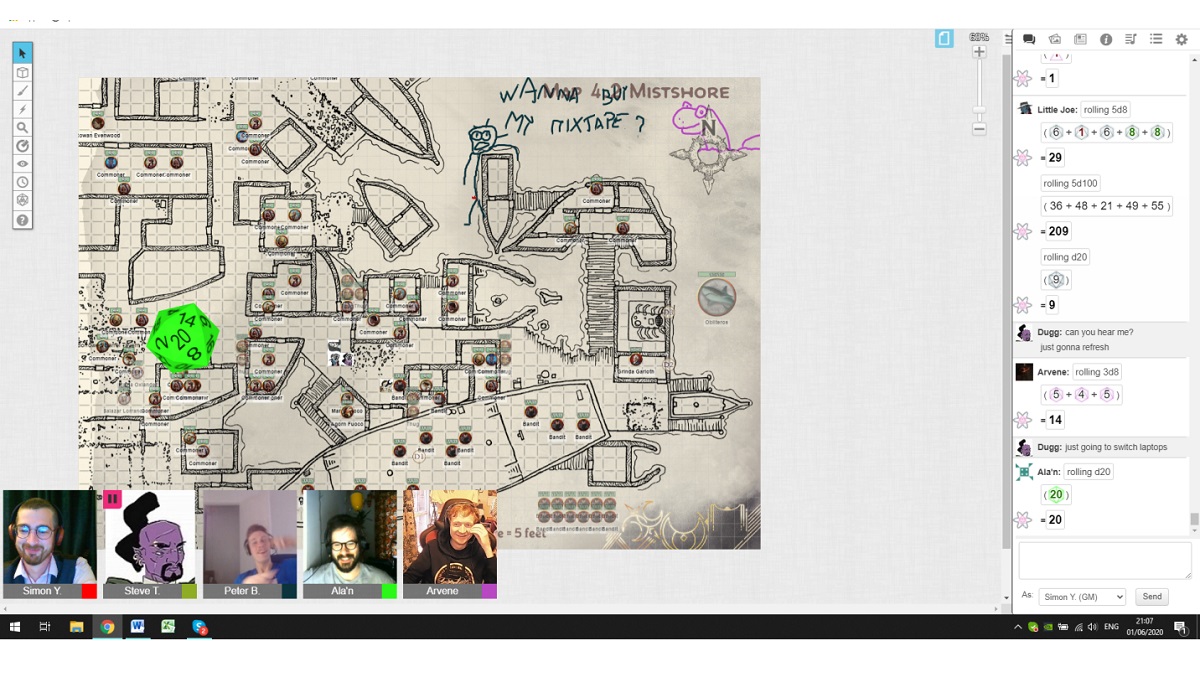 We began playing Dragon Heist online via Skype, using Discord, Trello, and D&D Beyond to keep track of campaign information, all whilst streaming our sessions live on Twitch. To date our record number of simultaneous viewers is 3.141592… Last night, however, we continued our trial of Roll20, a digital tabletop roleplaying game platform. We are using the official Dragon Heist Roll20 conversion and, this was our fourth session using Roll20.