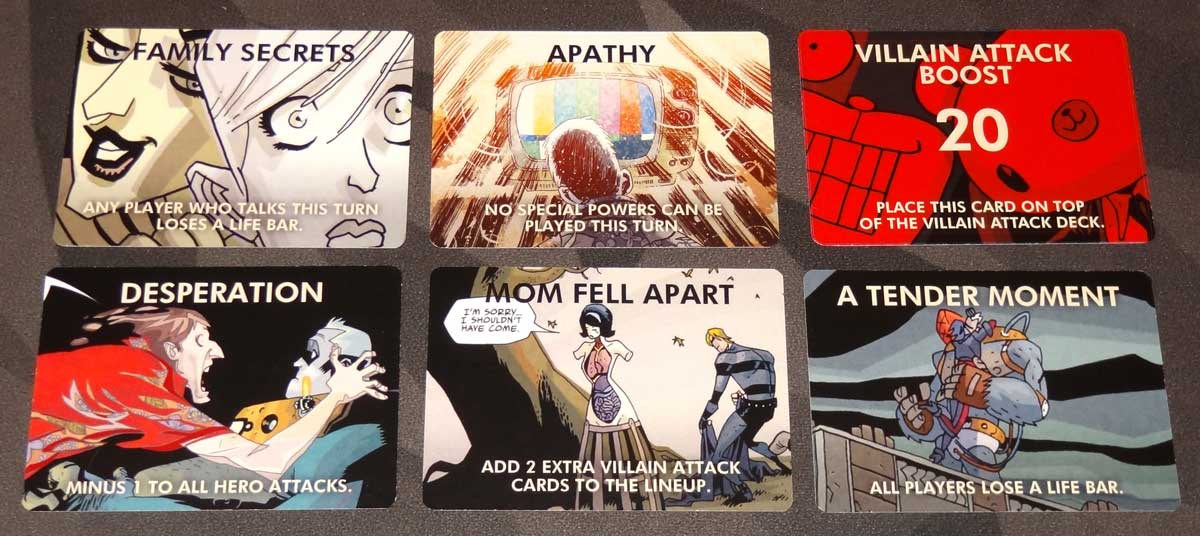 The places where you’ll get a taste of the theme are in the dysfunctional family cards, the story cards, and the player powers, primarily in the last one. What you’ll discover is that although there’s a whole deck of family dysfunction cards, there are really only a few different effects that are repeated with minor variations. “Dad Hid His Feelings” reduces all hero attacks by 1, but so do “Desperation” and “I Need Some Space.” The story cards are similar: “Ben’s Return” restores somebody to full life, as do Pogo, the Televator, and the Academy’s Destruction, among others.