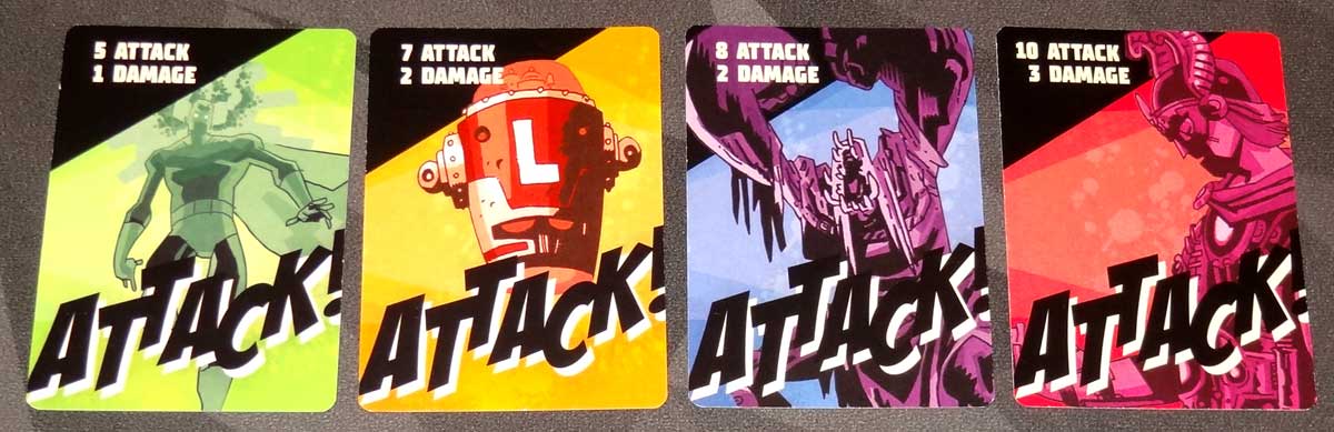 If you reach the end of the villain stack, then it’s time for the final battle! Take the villain cards from below the final battle card, shuffle them, and place them in a lineup. You’ll notice that their attack values and damage values are much higher than the regular villain attack cards.