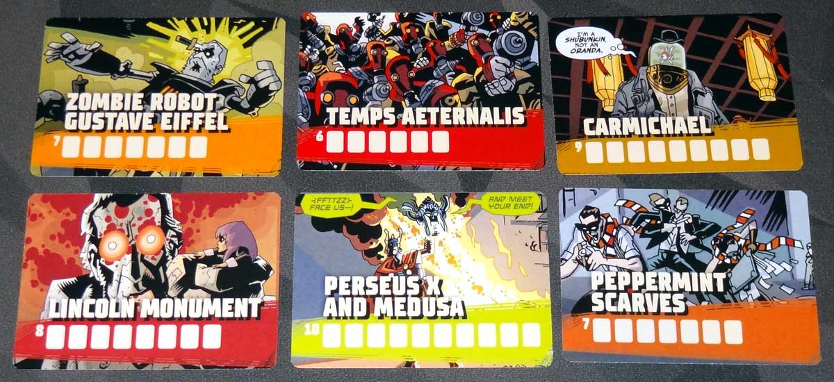I like the idea of a cooperative card game where the players—because of their various family dysfunctions—have trouble working together. That definitely seems in line with the story. If you’re only familiar with The Umbrella Academy through the television series, there will be a whole lot of villains in the game that you don’t recognize, but that’s not really a barrier. You don’t really need to know who the Peppermint Scarves or Zombie Robot Gustave Eiffel are to delight in their wonderful names. Whether you know how the Lincoln Monument came to life, you can easily imagine that he’s still a formidable opponent.