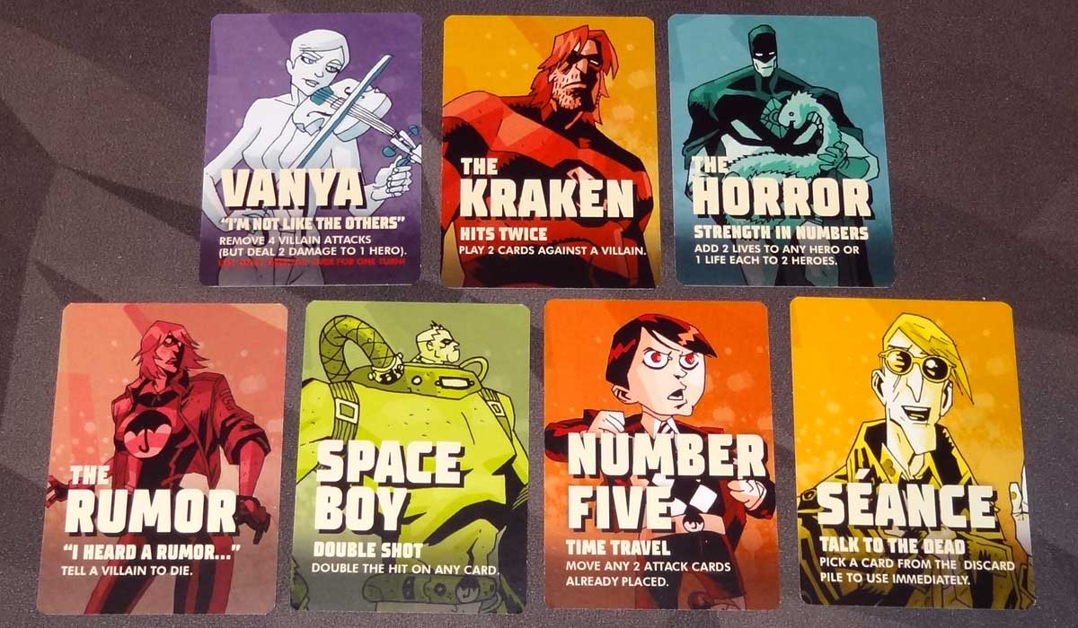But the other reason you don’t really need to know the story well to play the game is that, alas, all of the villains are basically the same: despite their colorful appearances and names, the only difference between the villains in the card game is the number of attack cards they’ll throw at you. They don’t have any special abilities to help immerse you in the theme or to distinguish themselves from each other. The Umbrella Academy may be a fantastic world to visit, but you’ll only get your foot inside the door.