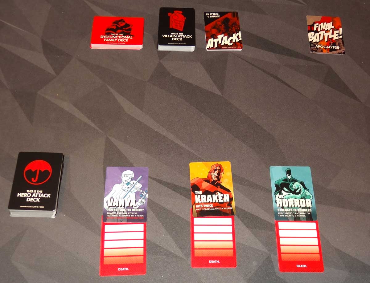 The Umbrella Academy Card Game is a fairly simple game as far as the rules go: you line up villain attacks, play through the lineup in turn order, and the resolve the attacks. Rinse, repeat. Although there are some choices to be made, like whether to play an attack card for its power or to heal, there are a lot of things you can’t change. For instance, the fact that you play against the villains from left to right, one time through, means that random chance has a large bearing on whether you can defeat the villains or not. If one player has a lot of high attack cards but their turns line up with the weaker villains, there aren’t a lot of ways to shift things around.