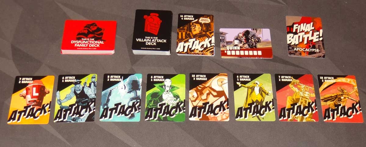 Each round, you’ll set up the next villain battle, draw a dysfunctional family card, and then fight the villains—first with your hero attack cards, then with your character abilities. If you survive the fight, then you move to the next villain.