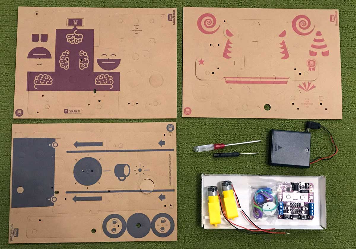 We’ll start with the Smartibot, which is available now from the Crafty Robot website for £55 (about $72 USD). The kit comes with three sheets of cardboard to build different configurations: the regular Smartibot, the Unicorn, and the Teabot (which can hold a mug of tea). There’s the circuit board that’s the brains of the outfit, plus a battery box, two motors, two small screwdrivers, and the various screws and nuts to assemble it, along with a few other bits like rubber bands for the wheels.