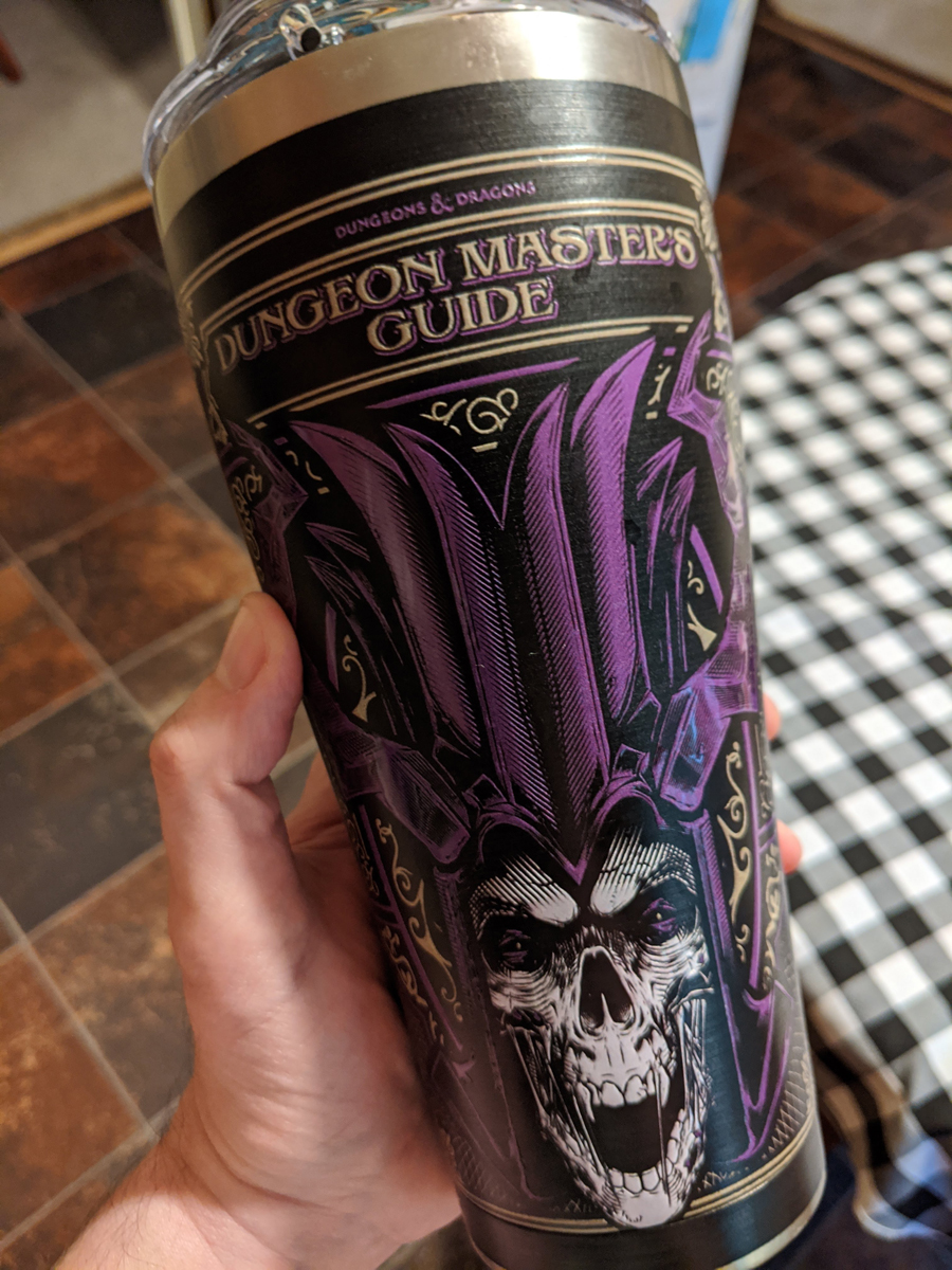I simply cannot express my delight when my review package arrived complete with an insulated tumbler festooned with the image of Acererak the demilich straight from the alternate cover of the 5th edition Dungeon Master’s Guide. (There’s also one with the Beholder from the Monster Manual if that’s your enemy of choice.)