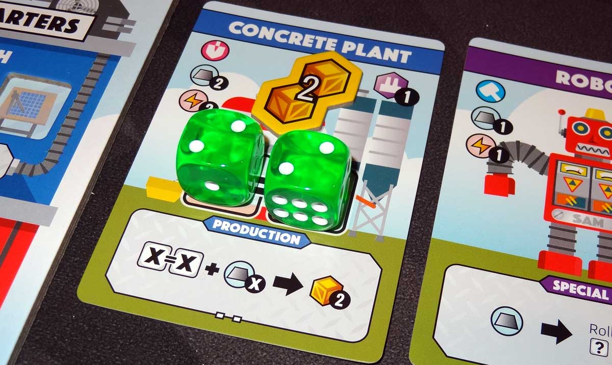 Likewise, it doesn’t help to build a bunch of production facilities if you can’t generate the resources (or roll the dice) to run them. Since many of the production facilities require sets of dice to activate, you’re limited by the number of dice you have (4, unless you have bonuses), which means that you might not be able to use all of them in the same turn. But having a variety does give you flexibility if you can’t manipulate the dice rolls.