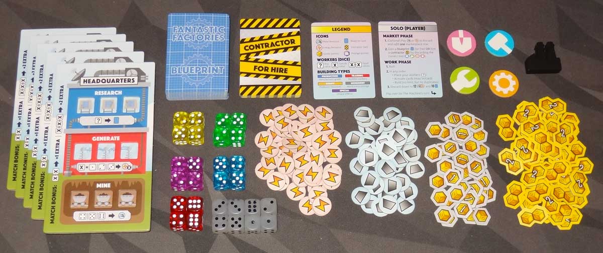 There are solo rules included as well. You play against the Machine, which starts with a set of blueprint cards (the more starting cards, the harder the game). You’ll play your turn as normal, using white dice, and the Machine will use a set of five different colored dice, which will indicate which card it takes from the market and whether or not it produces goods. Your goal is to score more points than the Machine, which has slightly different scoring rules than usual.