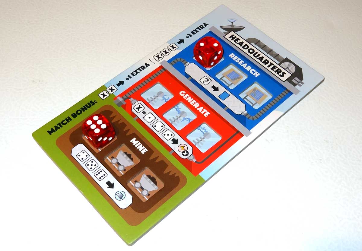 The player boards have been upgraded from the prototype: they’re now dual-layered boards, with recessed spaces to hold dice, and there’s also an illustration of your headquarters on it. It shows what dice can be used to generate blueprints, energy, and metal, as well as the match bonus. The only thing I don’t quite like is that the reference text about the match bonus is printed vertically along the side, and the placement of the “|” makes it look at first like the bonuses apply to the Research and Generate sections of your board, as opposed to being overall bonuses.