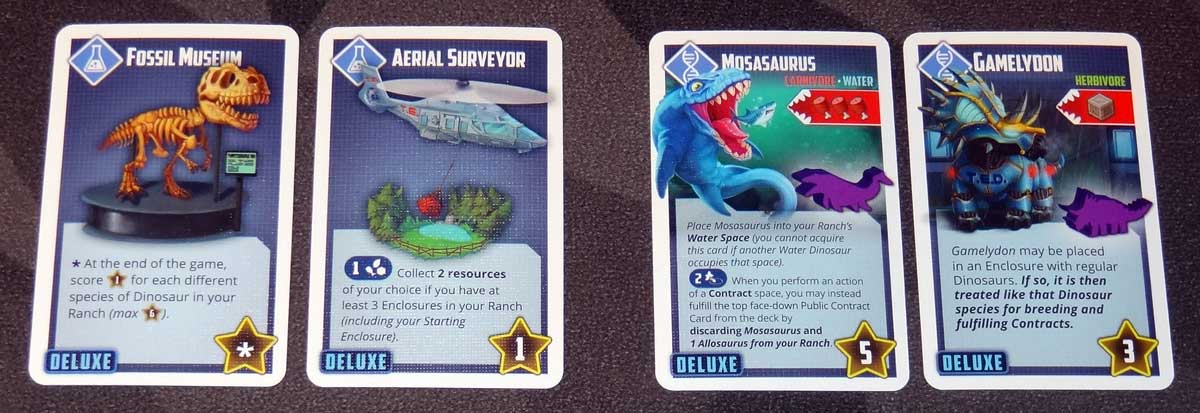 The Laboratory expansion adds a couple of things. First, there are four new research cards: a scoring bonus, a resource ability, and two new unique dinosaurs. These can be mixed into the base game even if you’re not using the laboratory mats.