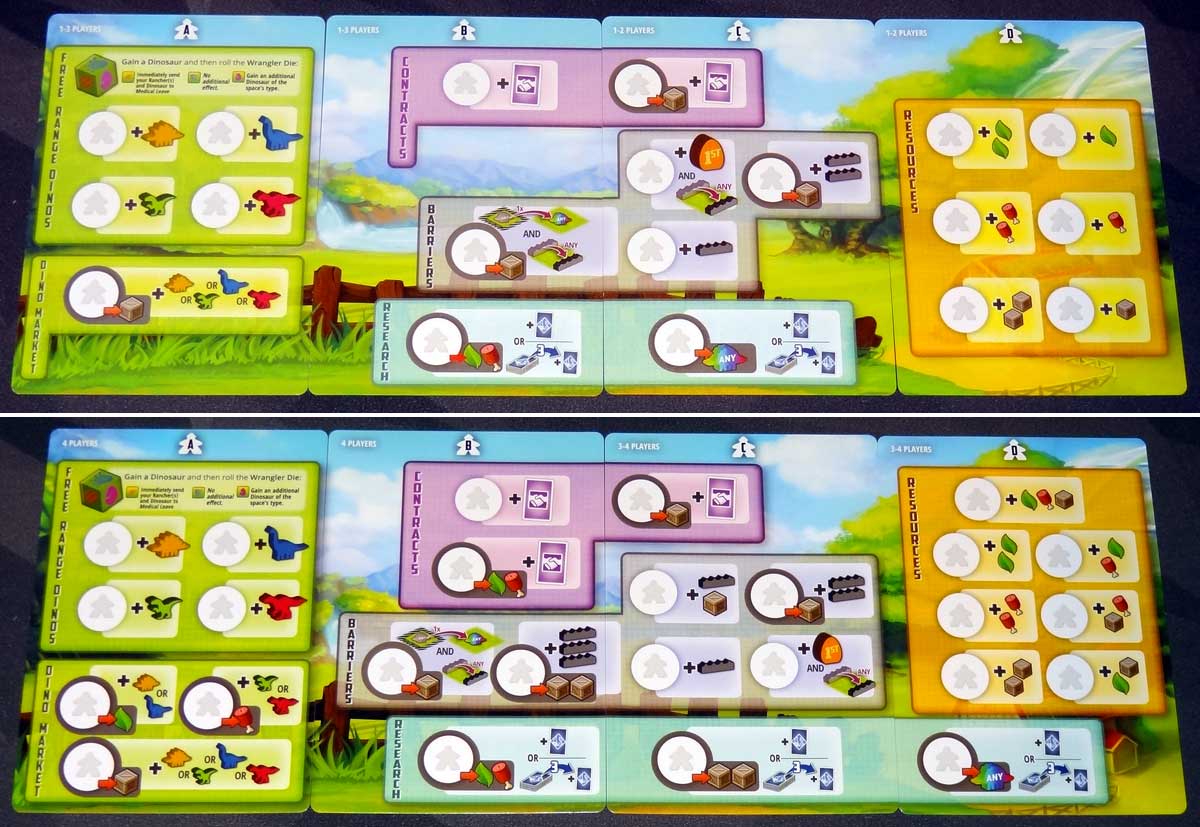 The four central mats are laid out in a row in the center of the table. They’re double-sided, each marked with player counts: the more players you have, the more action spaces there are.
