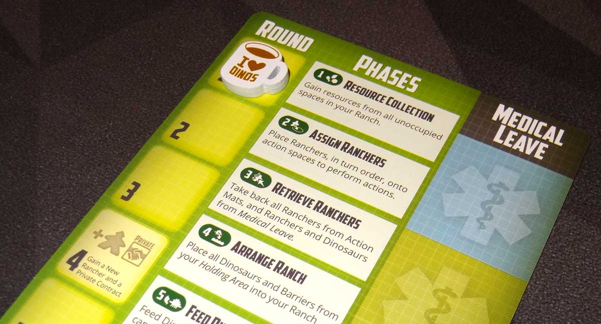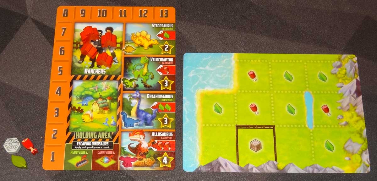 Your player mat has a track for the three resources (leaf, meat, and supply)—but you do need to be careful not to bump the card or you can lose track of where things were. The card is also used to store your unused ranchers as well as dinos and barriers that you collect during the round. Finally, the right side of the card has information about the four basic dinosaurs: what they eat and how many points they’re worth.