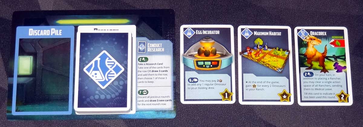 When you acquire a research card, you may take one from the face-up cards, or you may draw 3, choosing one and adding the others to the face-up market. Research cards include equipment that gives you ongoing abilities, end-game scoring bonuses, or even unique dinosaurs that have special abilities.