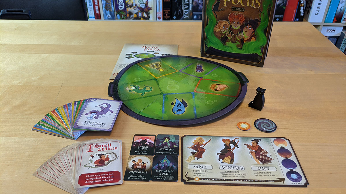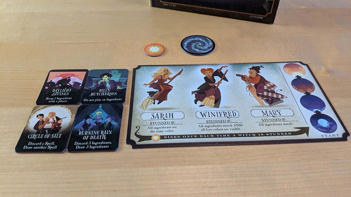 Perhaps now is as good a time as any to confess something: I’ve never seen Hocus Pocus. When it was in theaters nearly thirty years ago, it just didn’t seem interesting to me, largely because I’m just not that big of a Bette Midler fan. And over the years, that feeling hasn’t changed. Neither my wife or my son–my only playing partners in these times when we can’t have live game nights and now that my daughter has moved away to college–have seen it either. So, none of us were coming to the game from the perspective of being fans of the movie. Instead, we are looking at it merely from the perspective of the game by itself.