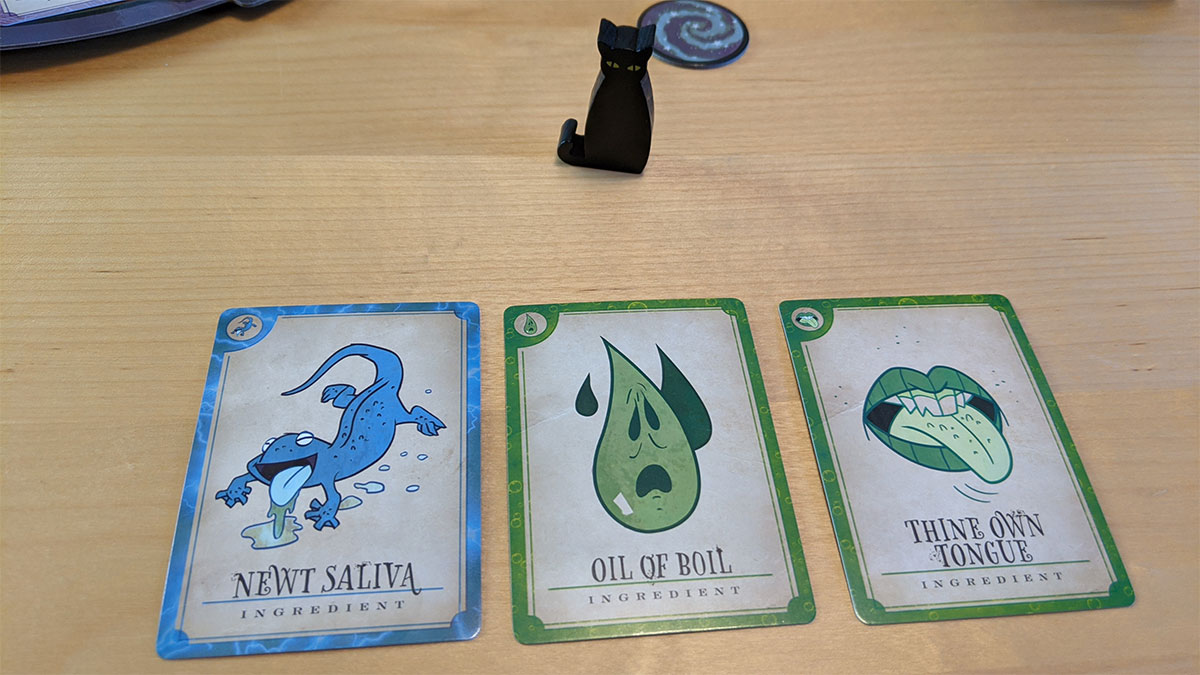 I already mentioned above the issue I have with the design of the spell cards by making the witch’s name, which is key to determining whether or not the spell takes effect, so small. I have a similar issue with the Binx and spell icons on the ingredient cards. It’s rather small and tucked up in the top corner of the card. Unlike normal playing cards, these have a distinct “top” and “bottom,” and that led the designers to only place this icon in one spot on the card. When we played, we found it very easy to miss, and frequently had to say, “oh, wait … I was supposed to draw a spell on my turn.” A simple redesign to make the icon much harder to miss would be a vast improvement.