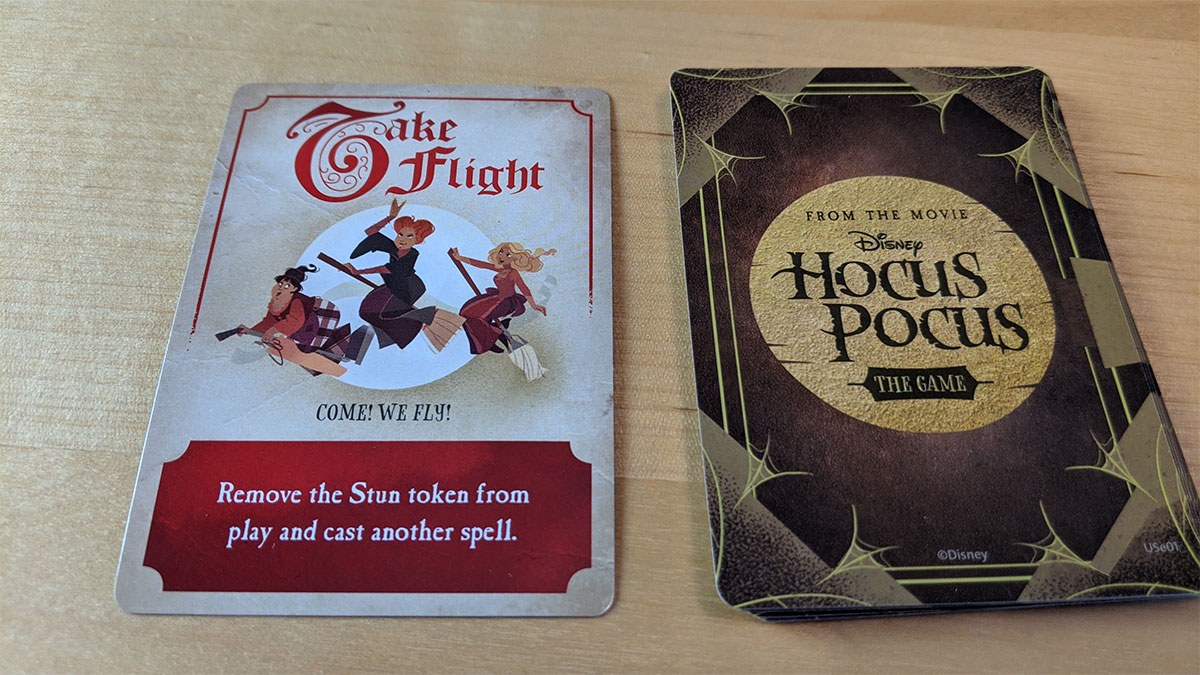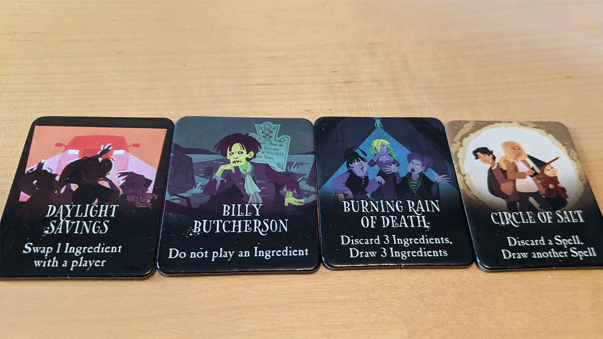 When a player plays a card with a spell icon, they draw the top spell card. As long as the witch casting the spell is not stunned, they read the text of the spell out loud and apply its effects (which are always bad for the players.) This is where the uneven distribution of the spells comes into play–Sarah is the easiest witch to stun, and also has the fewest (and weakest) spells, while Winifred is both difficult to stun and also has the most dangerous spells.