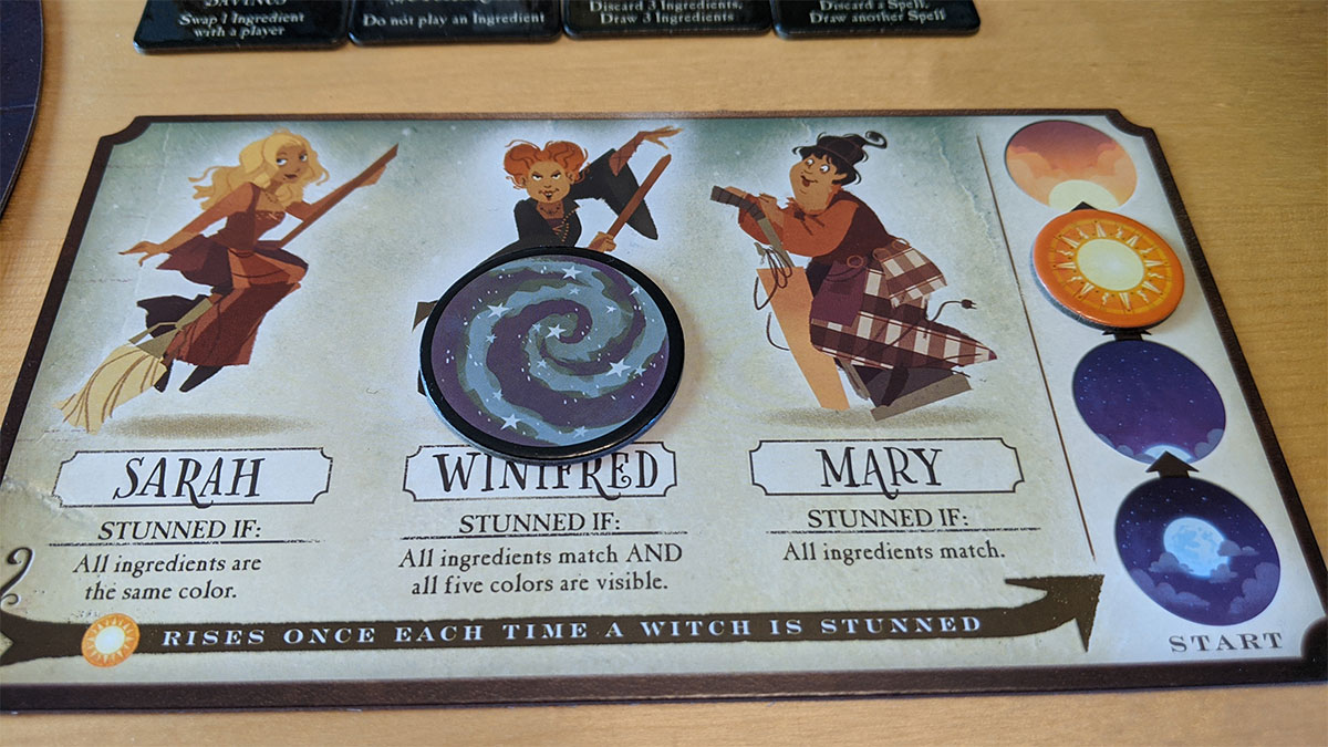 Place the witch board near the cauldron board, and place the Sun token on the lowest space on the Sunrise track. Set the Stun token nearby.