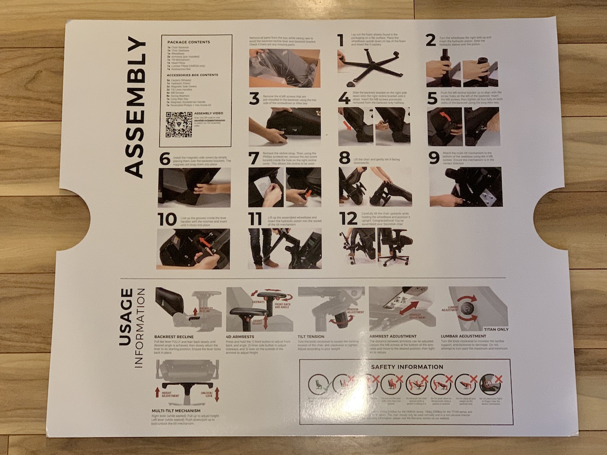 The Secretlab OMEGA arrived in a reassuringly heavy but (relatively) compact box. Inside there was no wasted space, but everything was perfectly packed and protected. It was all organized, and the company included the nicest pack-in tool kit and hardware assortment I’ve seen in a long time. They also included a big, detailed instruction sheet that you can set on the floor and easily follow, step by step.