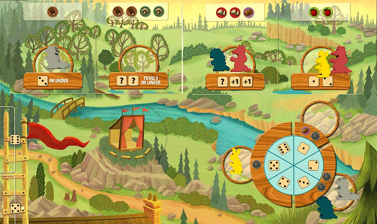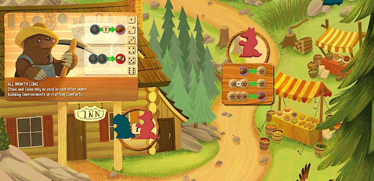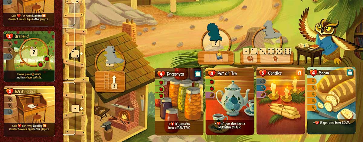 In many worker-placement games, there can be a fight over who gets to go where, if each space is limited. That’s not usually the case in Creature Comforts: just because somebody went to the meadow and collected some wheat and mushrooms doesn’t mean you can’t get the same thing, as long as you have the dice for it. The only two spots that can lead to conflict are the workshop and the owl’s nest, because one player might take a card that somebody else wanted—but these are simply resolved by which player gets to go first. However, if the player ahead of you doesn’t get the right dice values, you still have a chance.