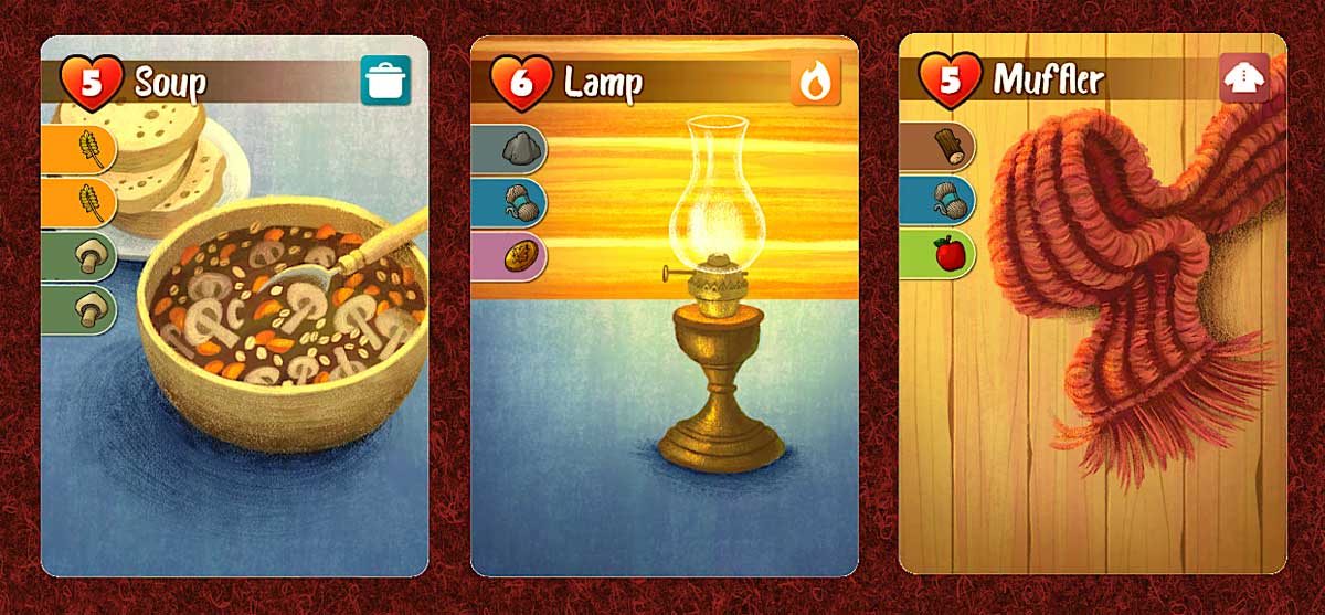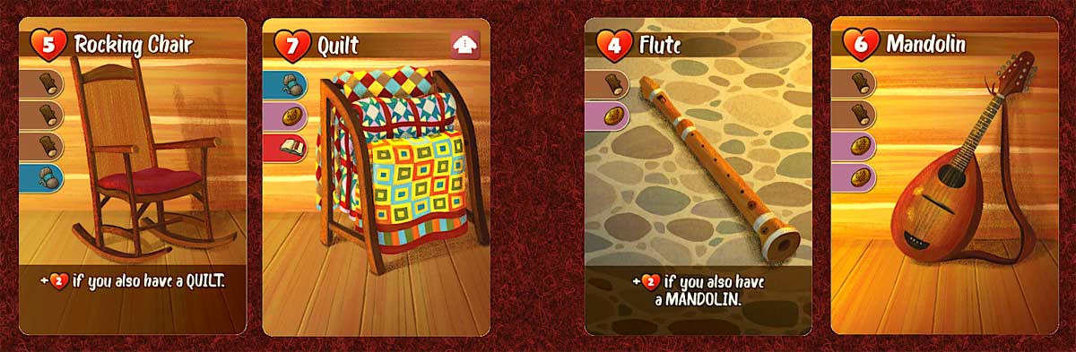 There are many comforts that give bonuses based on what else you have, with some that chain together. Stew gets 2 bonus points if you have Bread, which gets 2 bonus points if you have soup. But if you’ve been cooking up a storm, it makes the herb garden improvement (giving 1 bonus point for every food item made by other players) pretty attractive to everyone else. The fact that you can only hold 3 comfort cards in your hand at the end of the turn means that you can’t hoard that many things and just craft them at the end, so other players will know what sorts of bonuses they might get from your comforts.
