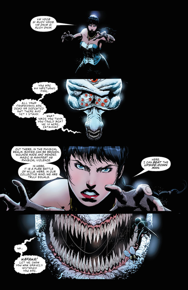 Ray: The main run of Justice League Dark concludes this issue, with an Endless Winter tie-in and a Future State miniseries coming soon. But for those who have been following the battle against the Upside-Down Man since the beginning, this issue delivers a spectacular finish that lets every surviving member of the team shine. When we last left off, Zatanna had sacrificed her mind and body to fuse with the Upside-Down Man in a horrifying final page. As the issue begins, she’s locked into combat with the monster in the mindscape – a battle that ends surprisingly quickly, and not in her favor, leaving the villain in control of her magic as he prepares to finish off the JLD. Good thing Wonder Woman has finally called upon the power of Hecate and is massively powered-up, but it may not be enough. As we’ve seen before, reality is largely a plaything to this villain.