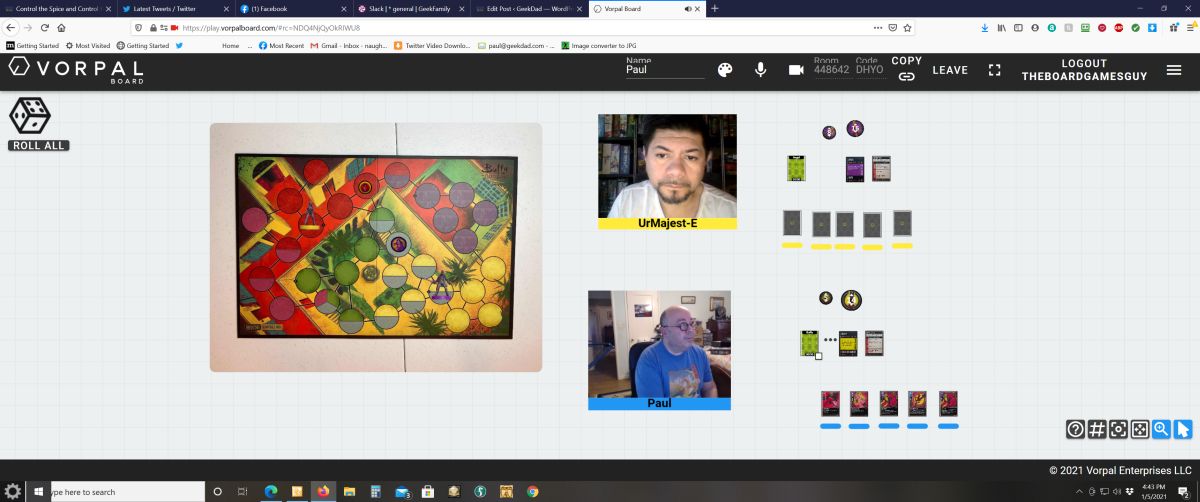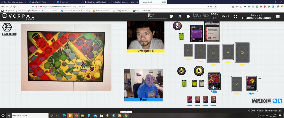 A big part of that is thanks to the integrated video chat. When I’ve played board games on Tabletopia, I have the game running on one monitor, and Zoom running on my second monitor. But with Vorpal Board, everything is on the same screen. Not only that, but you can move each person’s video feed around to anywhere on the screen, so if you want to emulate sitting together around a table, you can arrange the player areas accordingly.