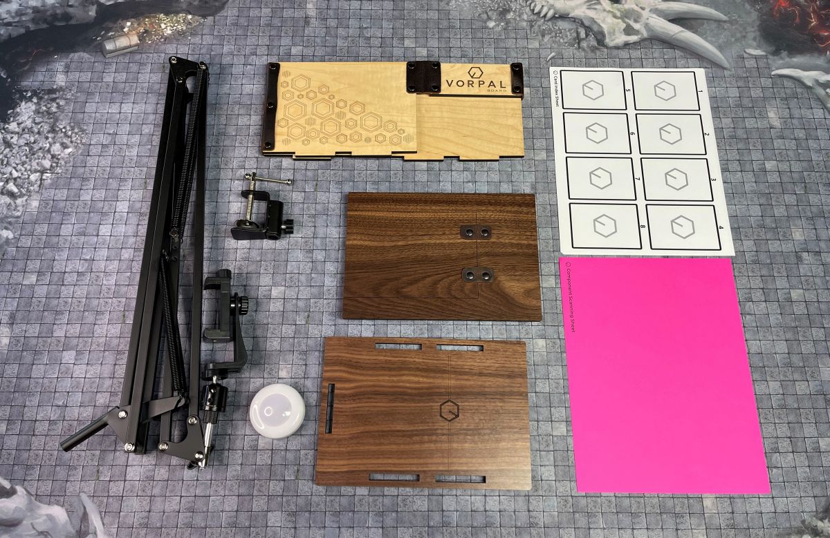 On the hardware end, the full Vorpal Board package consists of a wooden component scanning box, a boom arm to hold your cellphone for livestreaming, a light, a component scanning sheet, and three card index sheets.