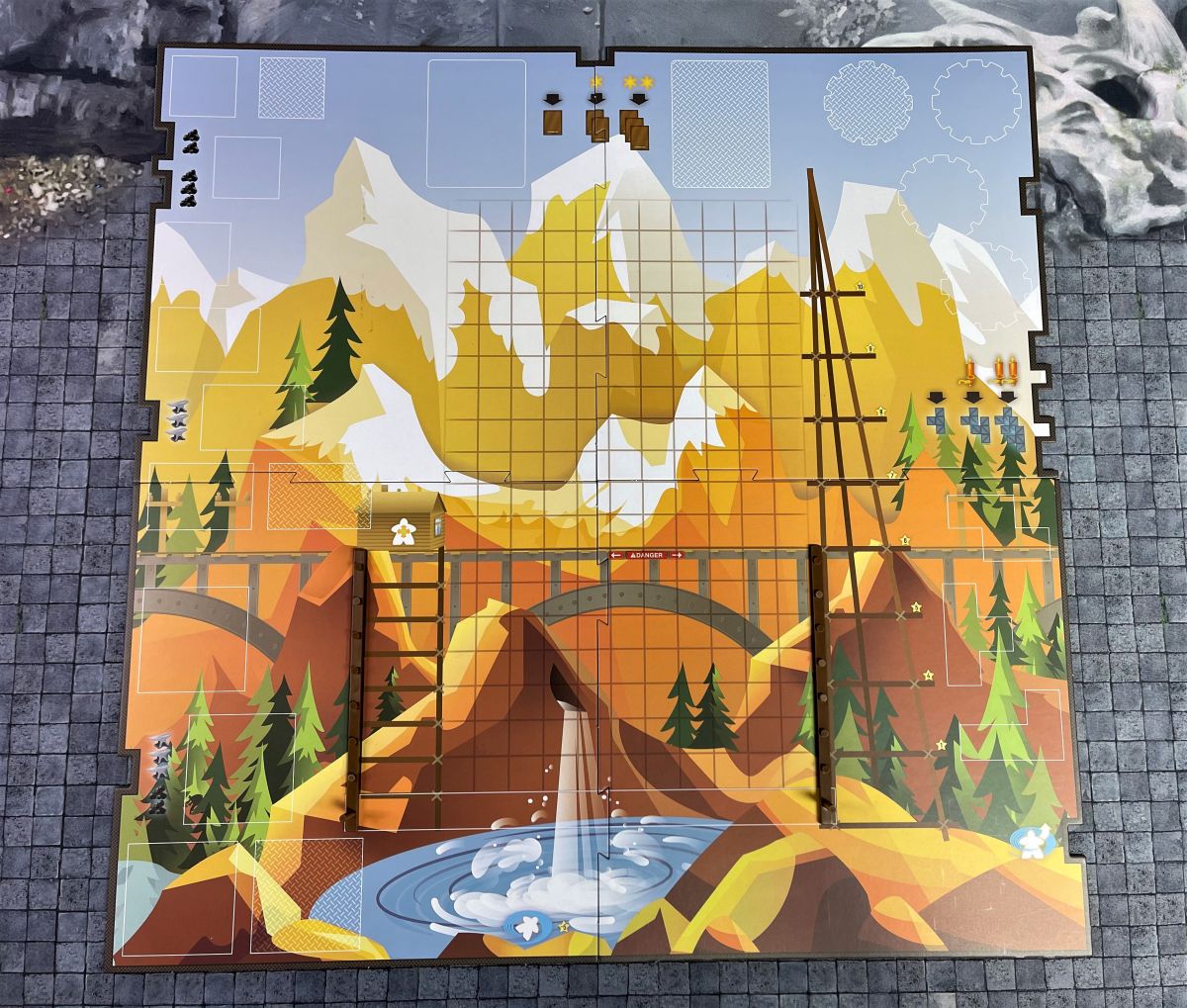 The four pieces of the Whistle Mountain game board lock together easily. I like that there are notches along the top and sides of the board for docking your airships(which are the workers that you place during the worker placement phase of the game). The stylized artwork of the Rocky Mountains is very nice visually, but also not overpowering when it comes to navigating the board. All of the important gameplay areas are clearly visible and easy to find.