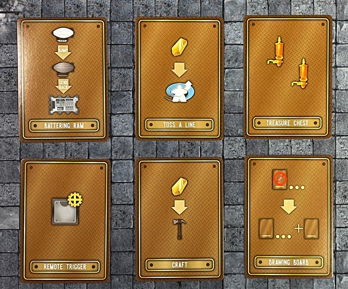 - Play one card. Carry out the effects shown on the card, then discard it. In the example above, Remote Trigger allows you to activate any machine, while Craft allows you to spend 1 gold to immediately build a scaffold or machine.