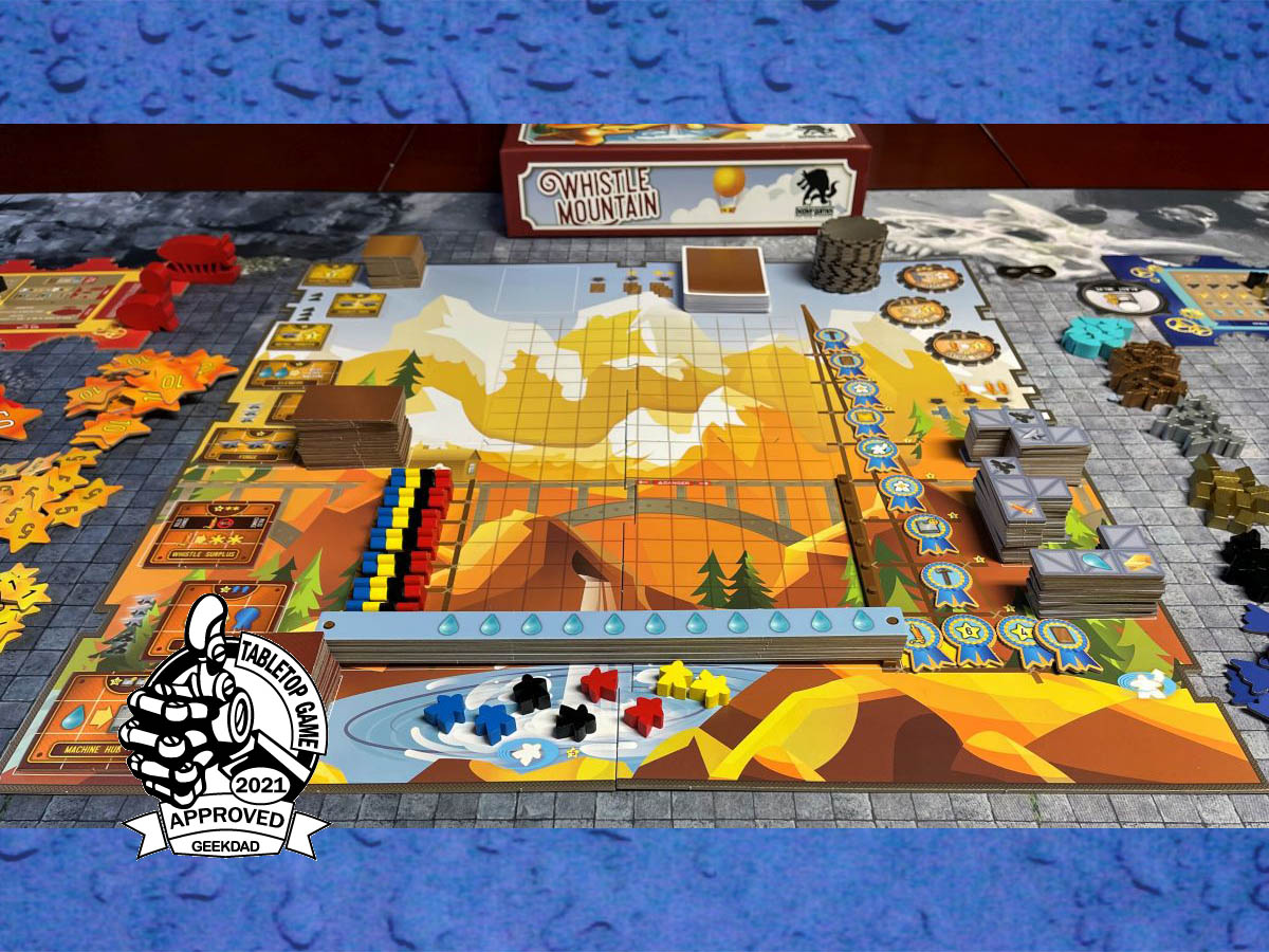Whistle Mountain is a game of worker placement and tile placement. It’s for 2-4 players, ages 14 and up, and takes about 60 to 90 minutes to play. It retails for $69.95 and is currently available to purchase on Amazon, directly from Bezier Games, or from game stores.
